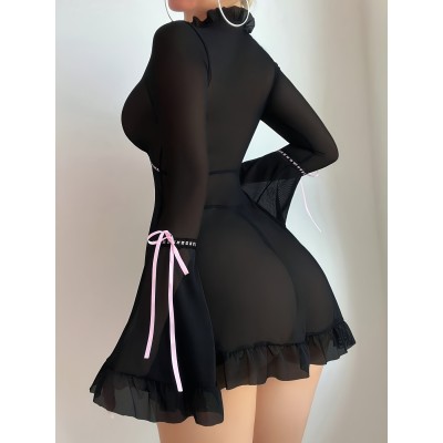 欧美跨境热销纯欲网纱花边透视长袖斑点睡裙睡衣情趣套装102701