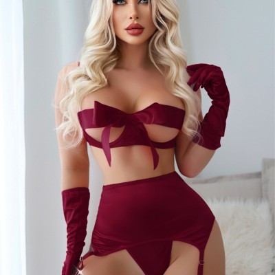 跨境外贸欧美新款性感镂空红色蕾丝情趣内衣套装32579